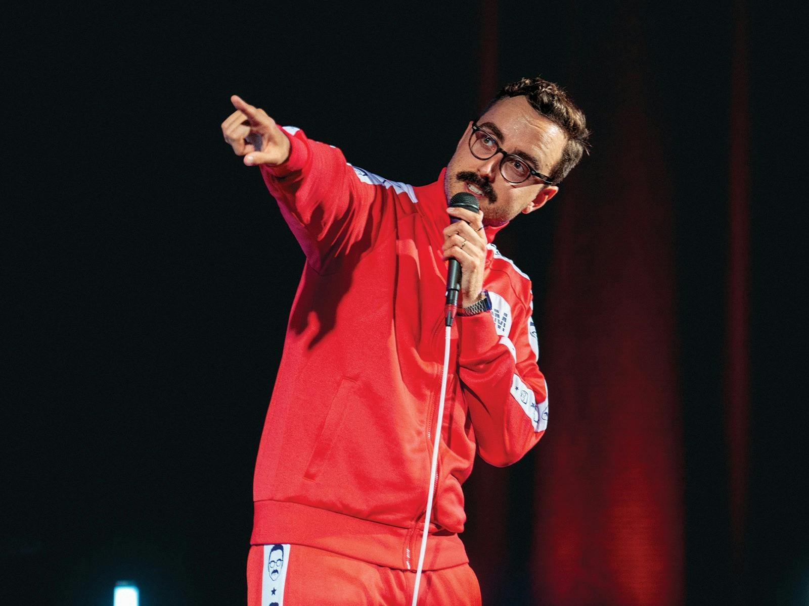 Daniel Muggleton is an Australian comedian in a red tracksuit.